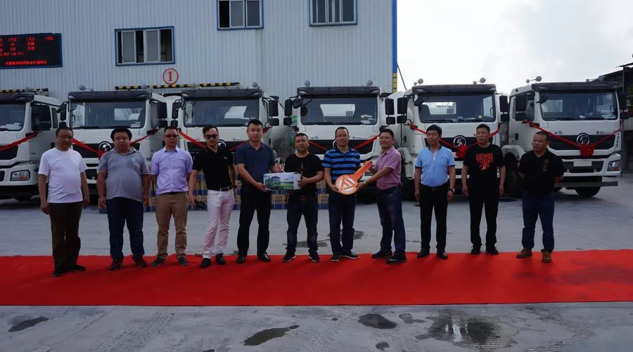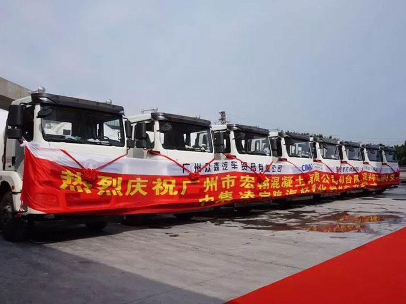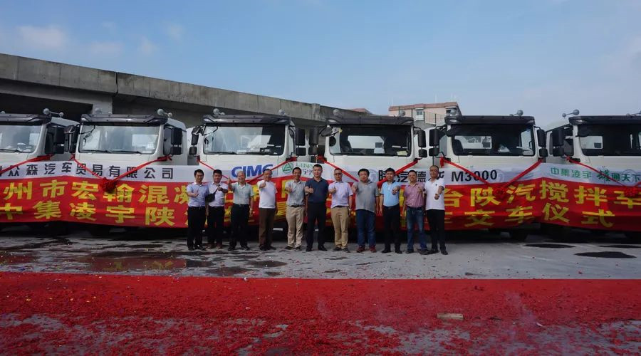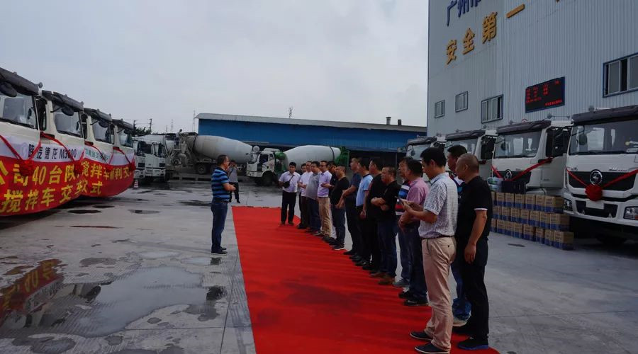 鞭炮齊鳴,彩花飛濺,鑰匙交付,廣州市宏翰混凝土有限公司40臺攪拌車交車儀式圓滿結(jié)束。