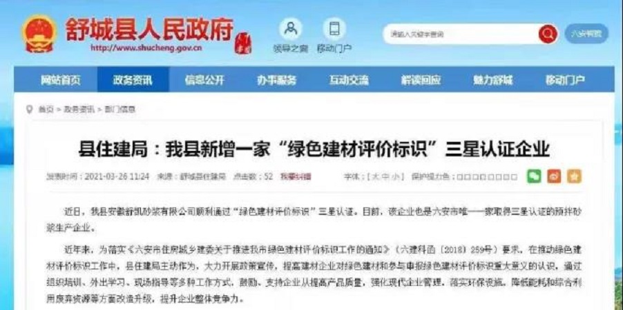 安徽舒凱砂漿有限公司成立于2019年,短短兩年的時(shí)間,先后被建材行業(yè)授予多項(xiàng)榮譽(yù)證書,并在今年順利通過(guò)“綠色建材評(píng)價(jià)標(biāo)識(shí)”三星認(rèn)證,成為六安市一家取得三星認(rèn)證的預(yù)拌砂漿生產(chǎn)企業(yè)。