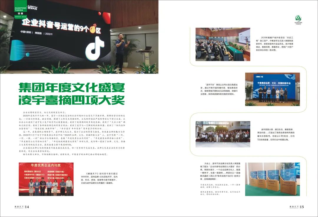 在2020年末,在中集集團(tuán)總部召開的“2020年品牌、文化、傳播職能大會”這一年度文化盛宴中,凌宇憑借“《罐通天下》、宣傳片、官方微信號和抖音號”的全方位傳播體系,喜摘 “年度企業(yè)內(nèi)刊獎”、“年度品牌傳播工具獎”、“年度微信公眾號影響力獎”、“年度短視頻運(yùn)營獎”四項(xiàng)大獎,成為囊括了品牌、文化、傳播三大類獎項(xiàng)的成員企業(yè),獲獎數(shù)量占整個(gè)集團(tuán)的15%。