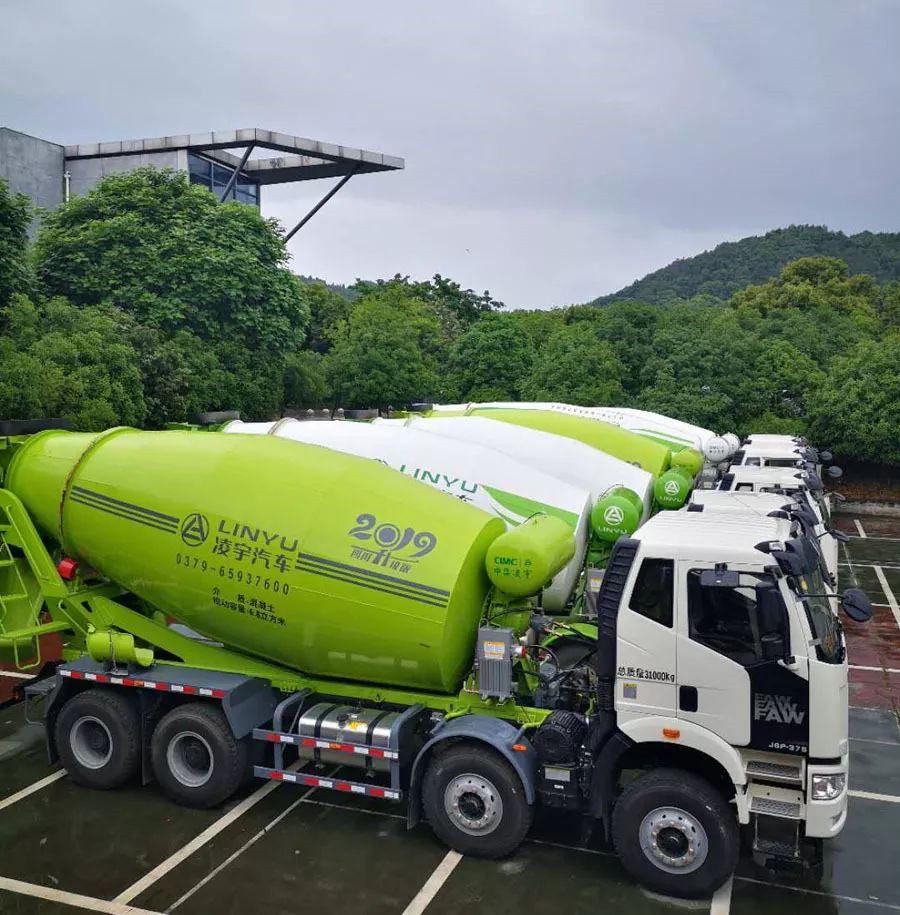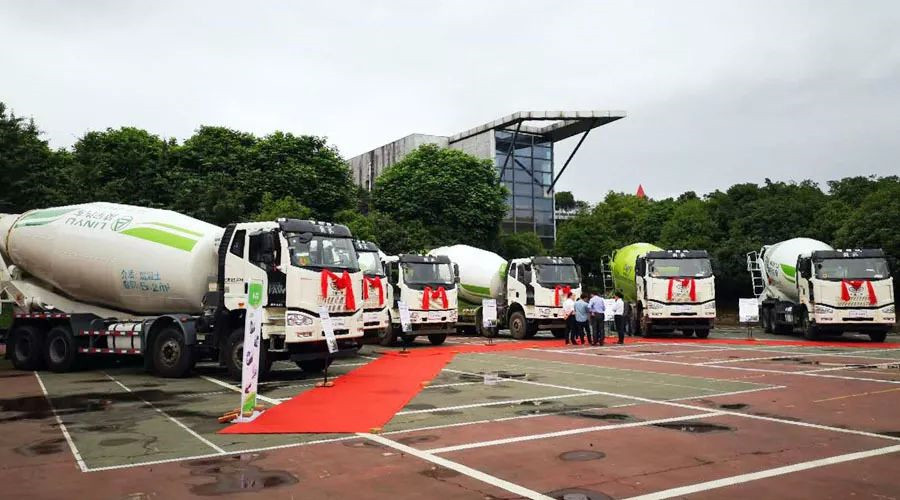 5月27日夜,天府之,成功之都,雨后初晴,華燈初上,彎銀月爬上翠綠的玉蘭樹(shù)梢,照在了成都博瑞花園酒店的廣場(chǎng)上,廣場(chǎng)上數(shù)臺(tái)氣勢(shì)非凡的攪拌車呈扇形排列,罐體上綠色“凌宇汽車”的圖案格外醒目,高大威猛的汽解放J6P車頭齊齊指向酒店的大堂。