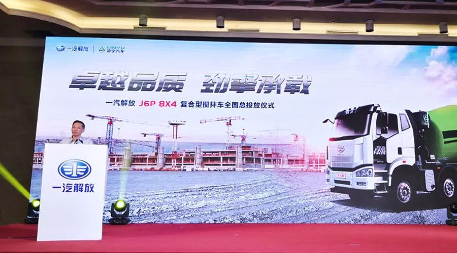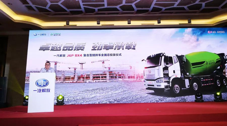 酒店會(huì)議廳燈火璀璨,高朋滿座,“汽解放J6P 8*4復(fù)合型攪拌車總投放儀式”正在這里隆重舉行。搭載中集凌宇上裝的汽解放J6P 8*4復(fù)合型攪拌車底盤(pán)正式對(duì)世人發(fā)布。