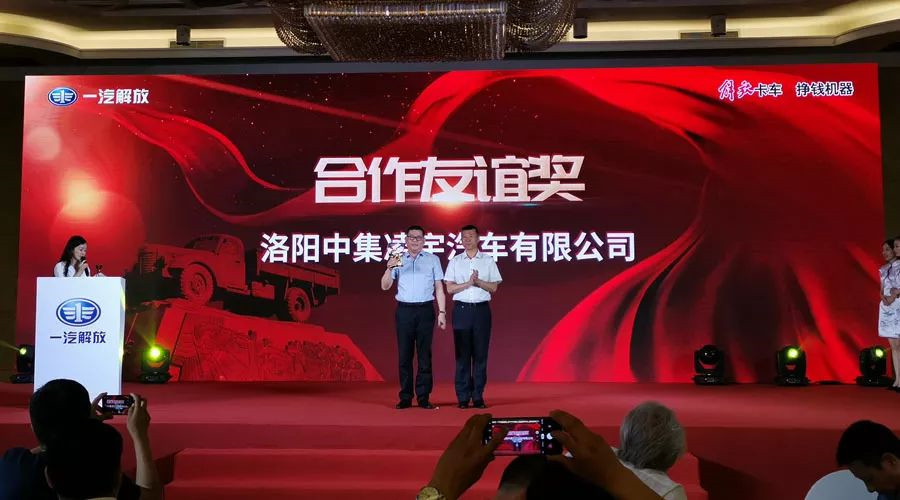 接下來(lái)進(jìn)入頒獎(jiǎng)環(huán)節(jié),汽解放為四川巨峰工程機(jī)械有限公司頒發(fā)了核心網(wǎng)絡(luò)獎(jiǎng),為洛陽(yáng)中集凌宇汽車有限公司頒發(fā)了合作友誼獎(jiǎng)。