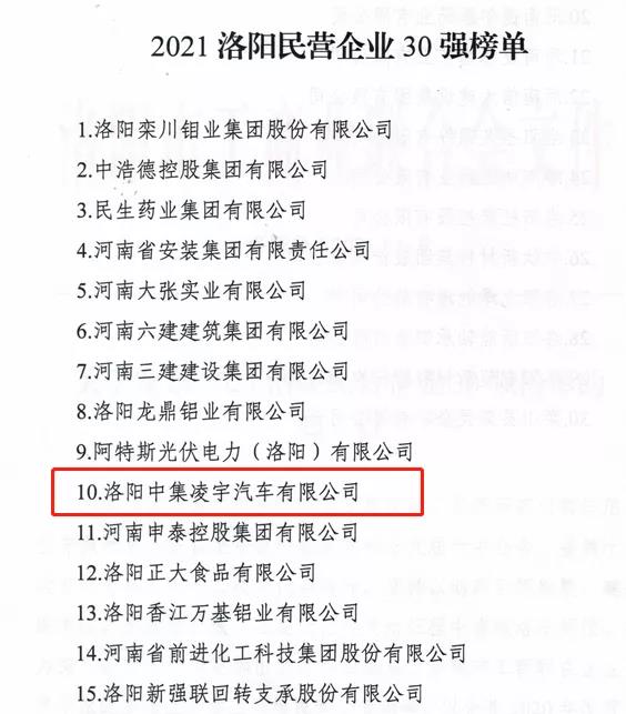 同期,由洛陽(yáng)市工商聯(lián)主辦的“洛陽(yáng)民營(yíng)企業(yè)30強(qiáng)”發(fā)布會(huì)上,中集凌宇憑借穩(wěn)健的發(fā)展實(shí)力,位列“2021洛陽(yáng)民營(yíng)企業(yè)30強(qiáng)”第十位。