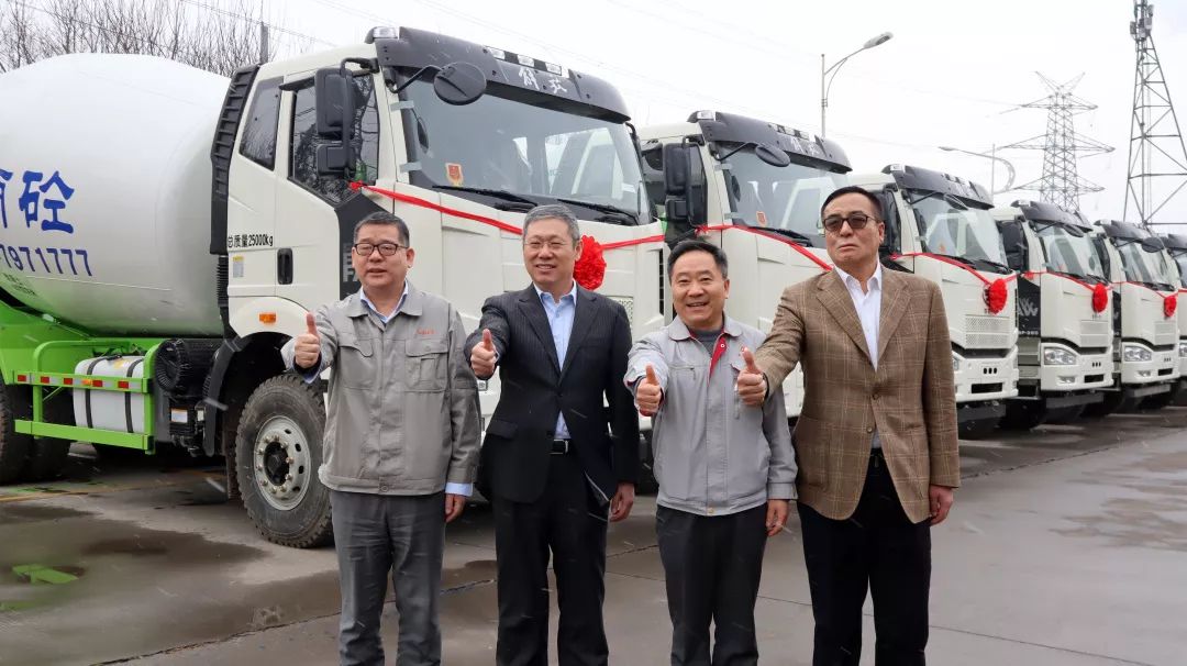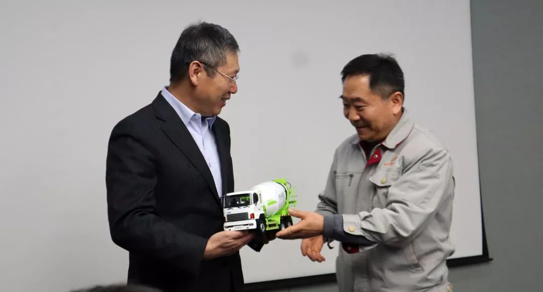 ,中集凌宇總經(jīng)理劉寶山向一汽解放董事長胡漢杰贈(zèng)送了凌宇攪拌車模型。