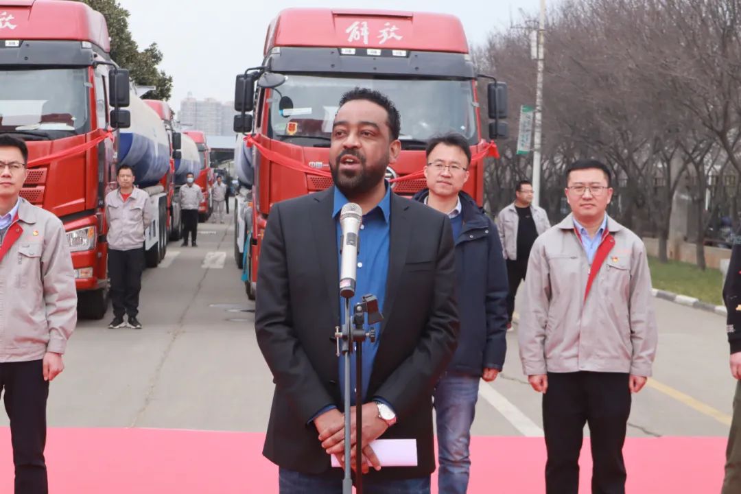 發(fā)車儀式現(xiàn)場,中集凌宇液罐事業(yè)部總經(jīng)理錢民、液罐事業(yè)部副總經(jīng)理兼液罐銷售部長胡江生、營銷公司副總經(jīng)理兼海外市場部部長周亞南及營銷公司黨支部書記郭朝陽和非洲客戶出席了發(fā)車儀式。