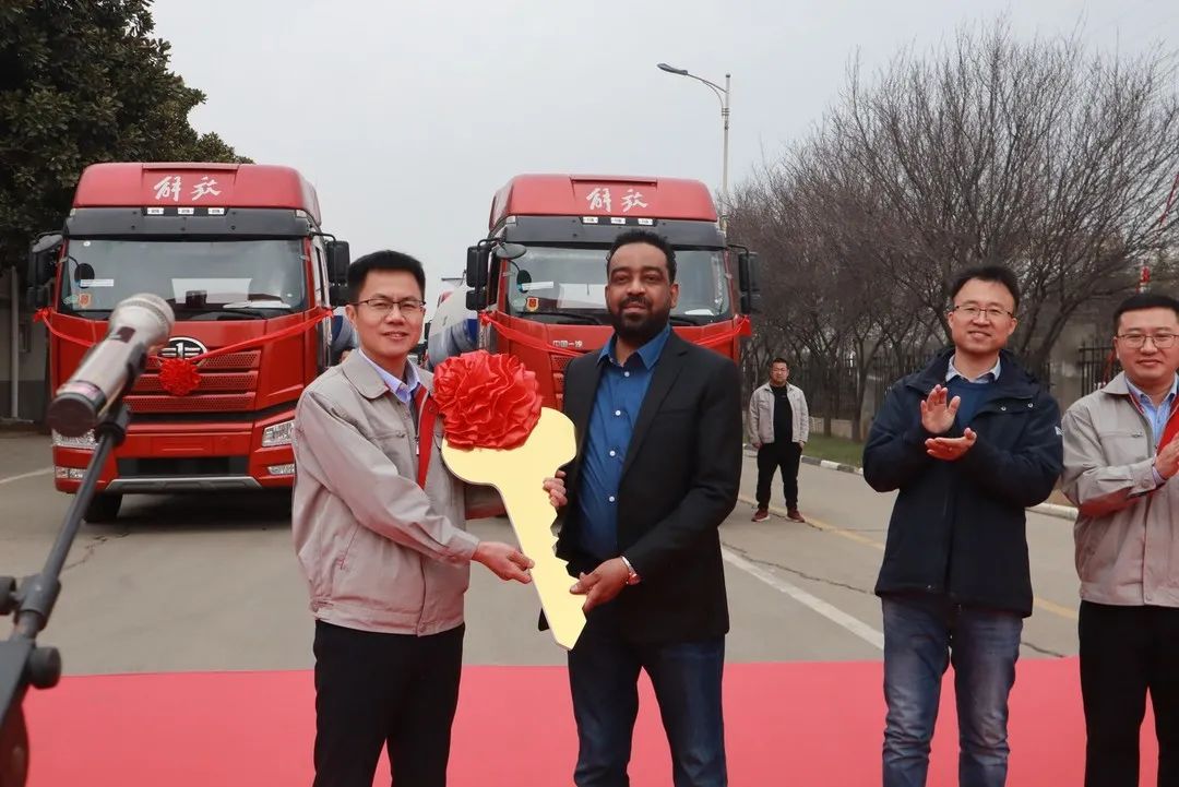 3月至,春如期。3號上午,凌宇廠區(qū)東廣場處人頭攢動,熱鬧非凡,十余輛嶄新的液罐車頭戴紅花,整齊排列在廠區(qū)道路上蓄勢待發(fā),它們即將跨越萬里奔赴非洲蘇丹。