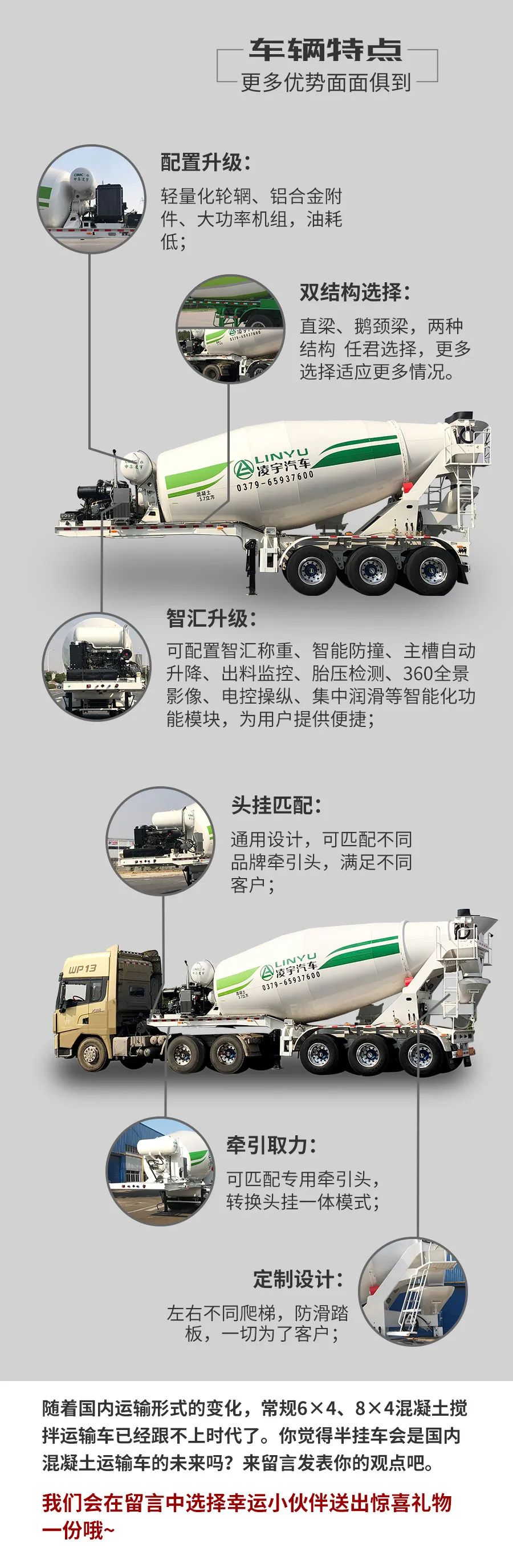 近幾年,各地區(qū)為了響應(yīng)國家“治超限超”政策法規(guī),紛紛制定了-系列的政策。常規(guī)6X4、8X4混凝土攪拌運(yùn)輸車運(yùn)載量已經(jīng)滿足不了工地及客戶的需求。如何在滿足法規(guī)的前提下,加大混凝土的運(yùn)載量,減少客戶運(yùn)輸成本、提升客戶的運(yùn)輸效益,成為了凌宇近期關(guān)心的問題,混凝土攪拌運(yùn)輸半掛車應(yīng)運(yùn)而生。
